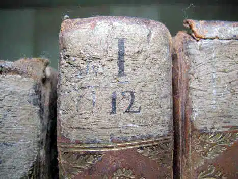 The books were catalogued on the upper section of the spine with black India ink. According to Geiger, “the highest numbers of the four sections into which the library was divided were I/79, II/119, III/113, and IV/84.” Photo courtesy of California’s First Library.