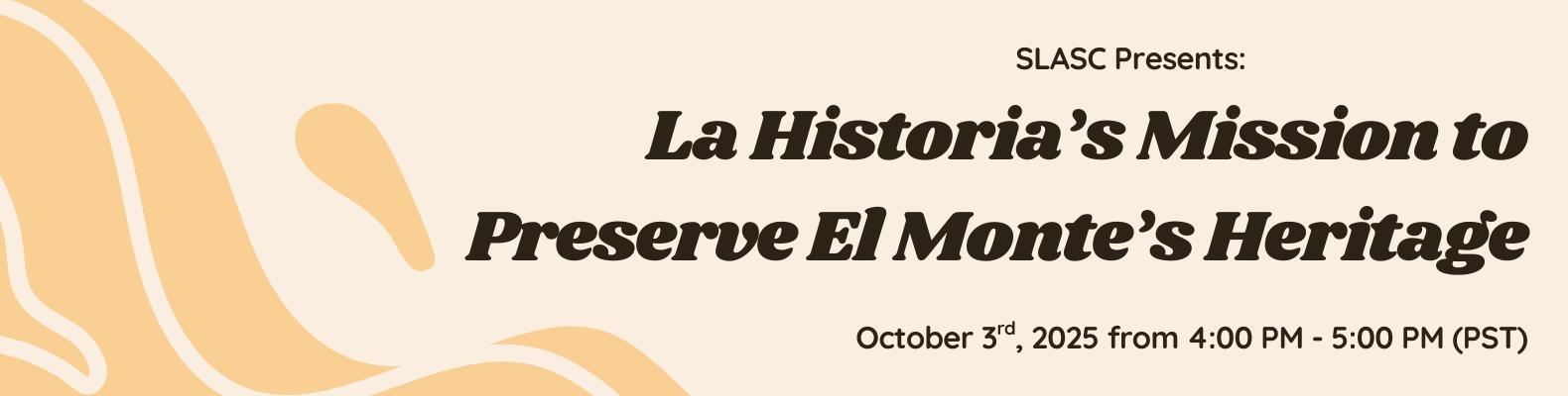 Please join the Special Libraries Association Student Chapter (SLASC) on Friday, October 3rd, 2025 from 4:00 pm to 5:00 pm (PST) for a special presentation from the El Monte nonprofit, La Historia. Their mission is about preserving Mexican American history through community engagement and collaboration. Join us in hearing how Nena and Bianca accomplish this as either someone also working full time in a public library, or as someone who has needed to master the rules of archival practice in order to realize when its important to bend them.