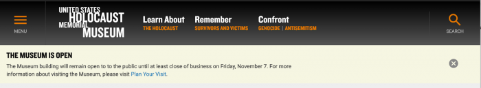 A somewhat ambiguous message about the USHMM’s continued accessibility. Screenshot taken October 29, 2025.